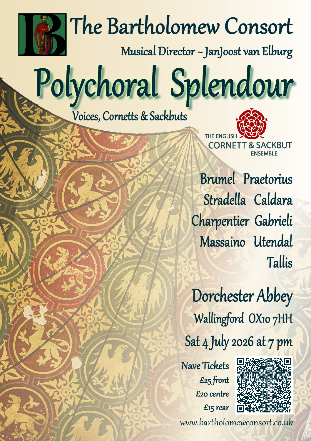 The Bartholomew Consort is marking 25 years of singing some 75 concerts with Dutch conductor, JanJoost van Elburg, by coming together in Dorchester Abbey with the English Cornett and Sackbut Ensemble (ECSE) to present this fitting programme of Polychoral Splendour. It begins with a Kyrie written in 1497, and a thread of the Latin mass is woven through works from the mid Baroque period, ending with a setting of the Agnus Dei.  The second half of the concert is firmly placed in the Renaissance. The opulence of the period is represented by the intricate and multi-layered choral writing by composers from across Europe, culminating in Tallis’s timeless Spem in Alium.   In each half there will be an instrumental piece.